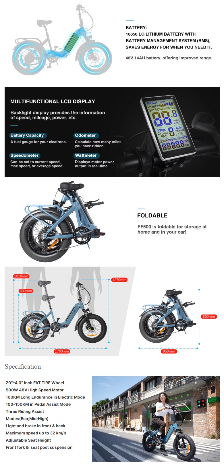 DYV FF500 2024 E bike 20″ 48V 14AH 500W 7 Speed fat tire Hybrid Ebike Off Road Mid Drive Color: Sky Blue