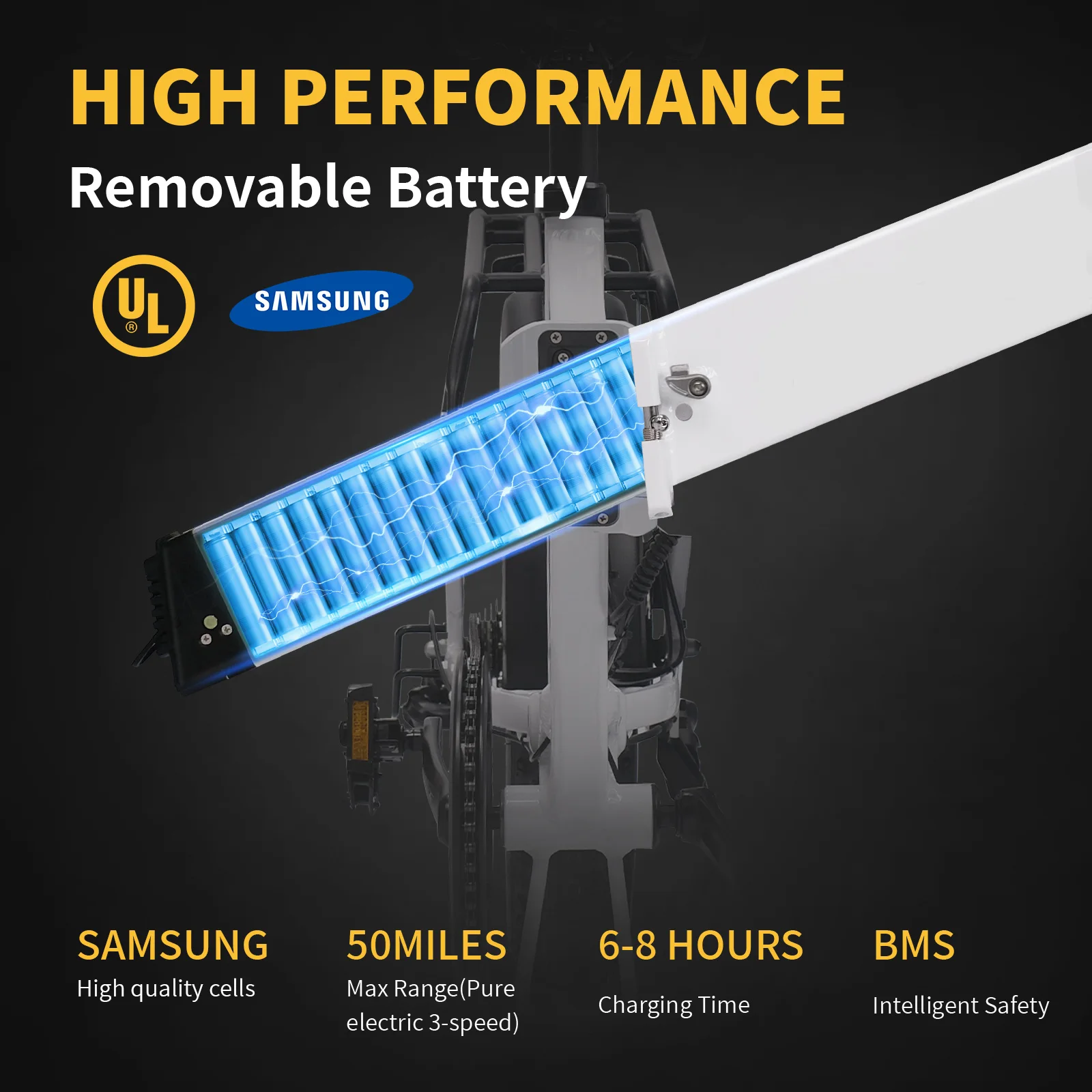 Available in two colors: Obsidian Black/Pearl White. Equipped with a 48V 500W (peak 1000W) brushless hub motor, with a top speed of 21 MPH. Legal for use on public roads in all 50 states of the US, no driver’s license or insurance required! 48V 12.8Ah battery with a real-world range of 60 miles (20 miles per day, only one charge per week), 1,000 cycle lifespan, and a hidden battery compartment for theft prevention and water resistance.