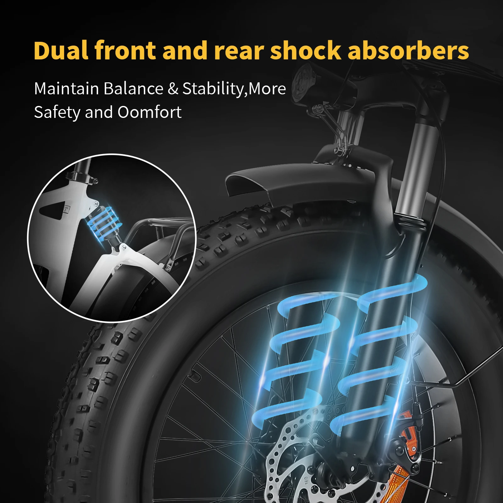 20×4-inch puncture-resistant tires + hydraulic adjustable front fork, filtering out vibrations from manhole covers and gravel roads. Dual 160mm disc brakes, with a braking distance on wet surfaces at 21 MPH reduced by 50% compared to V-brakes. 300-pound high load capacity, reinforced aluminum alloy frame (31.2 kg including battery), ensuring worry-free cargo commuting.