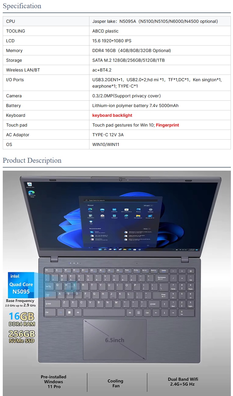 Gaming laptop 15.6 inch N5095 2.90Ghz 16GB RAM 512GB ROM Win 11 color: black
