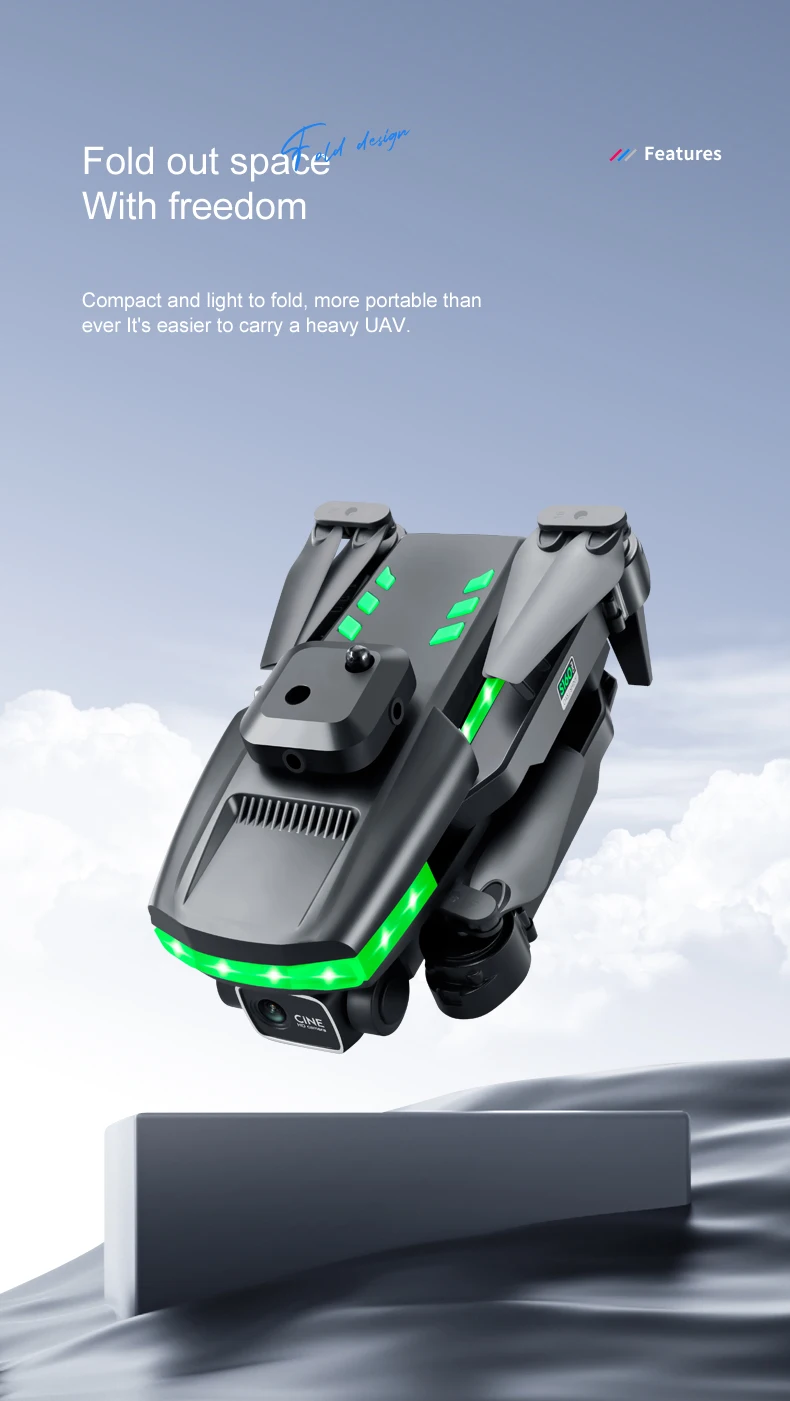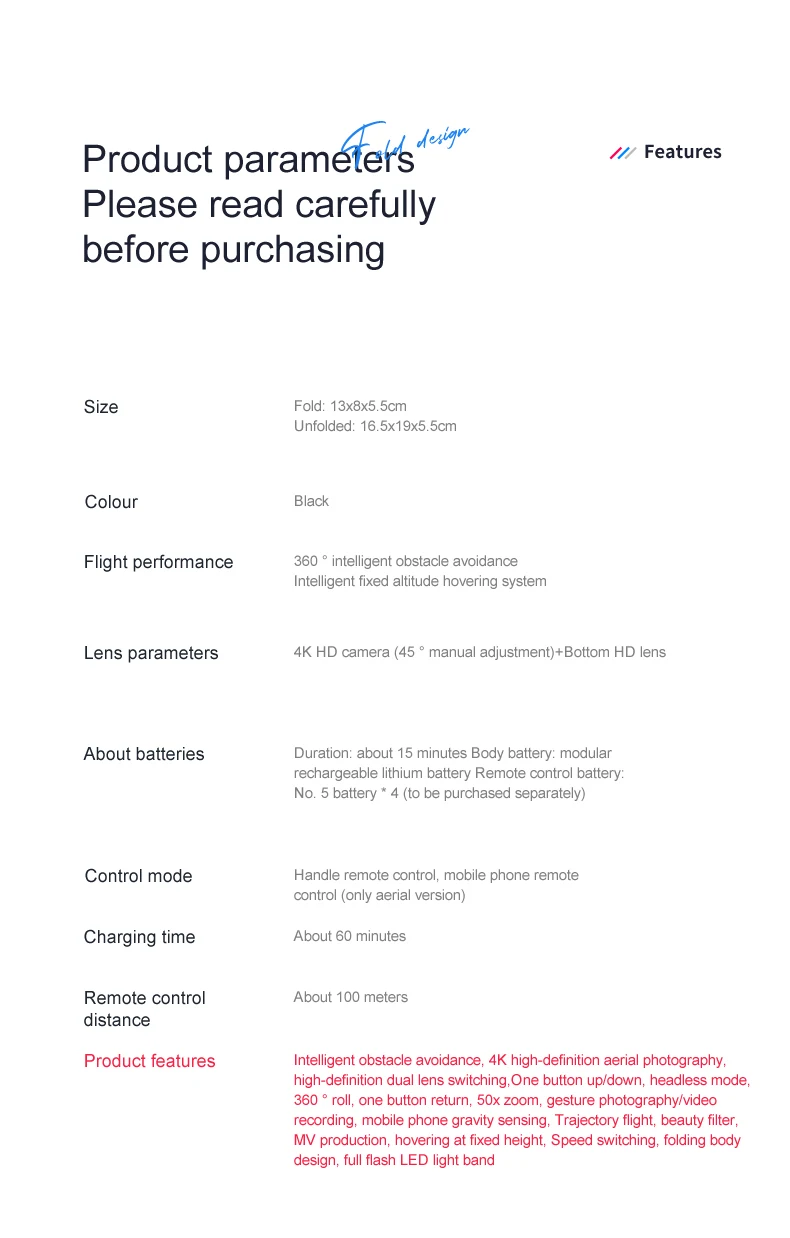 Four side obstacle avoidance, fixed height function, aircraft folding, six pass band gyroscope; One-click take off, one-click land, rise and fall, forward and backward, left and right side flight, steering, headless mode, body light/headlight (with camera
