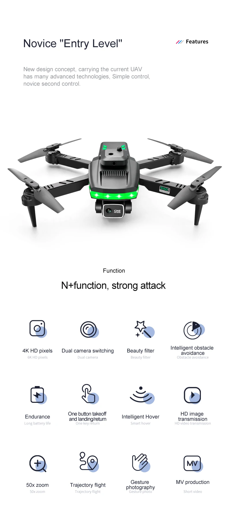 can add functions: gesture photography, video, headless mode, emergency stop, trajectory flight, gravity sensing, music, 50x zoom, automatic photography)